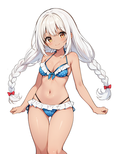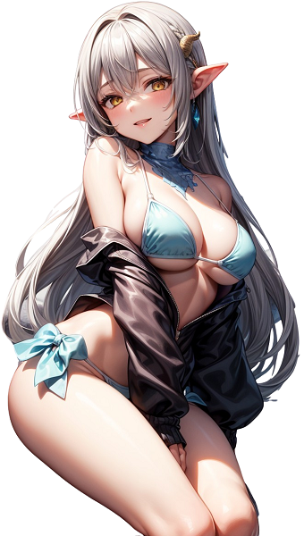 クイラ・エフィルロス:普段は衣服の内に収められている肉感的な肢体が露わになる。水色のビキニに、水色のリボンが少しだけ可愛らしさを添えている。